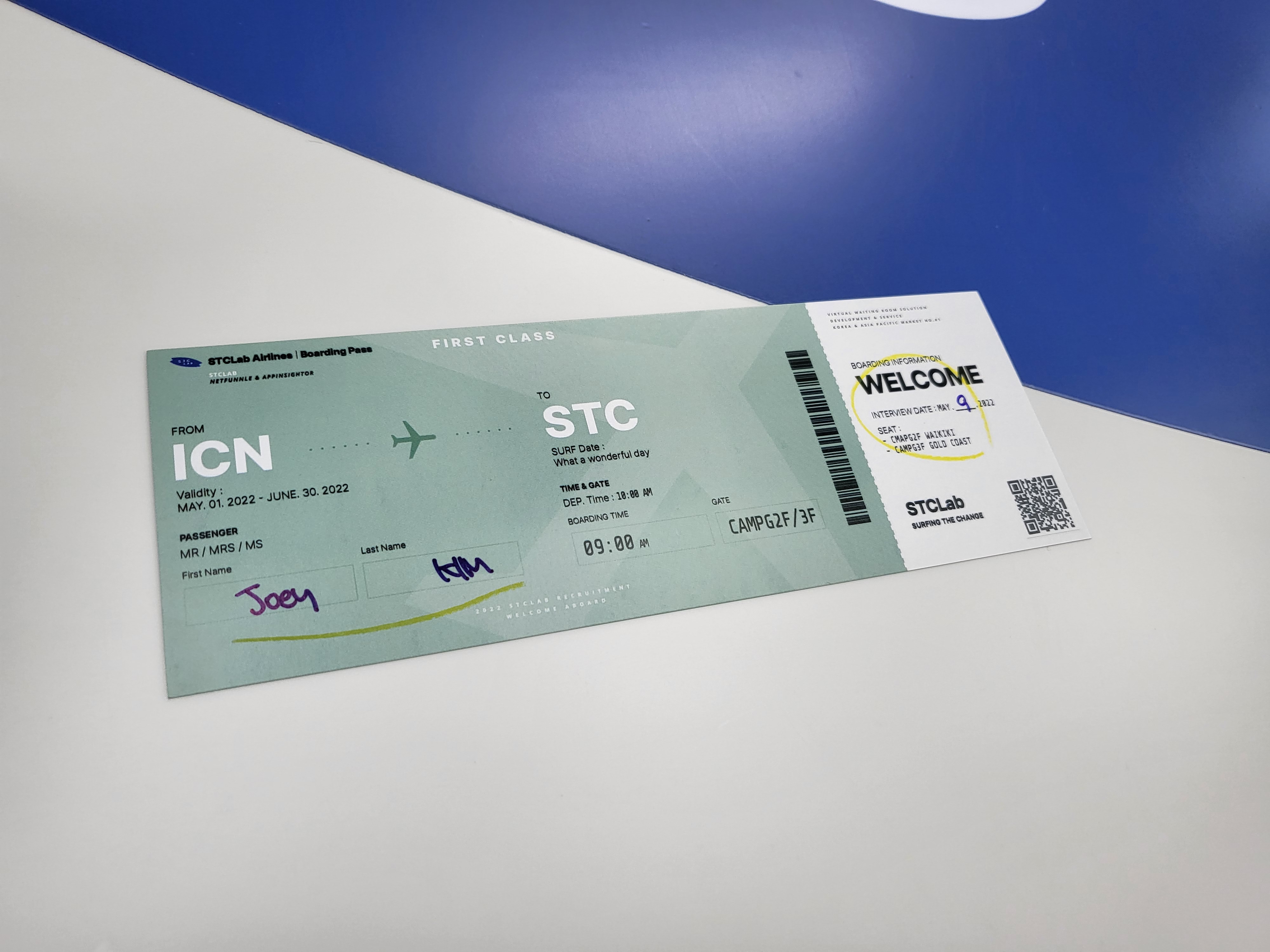 에스티씨랩으로 향하는 편도행 티켓을 멋지게 디자인해서 선물하고 있습니다.